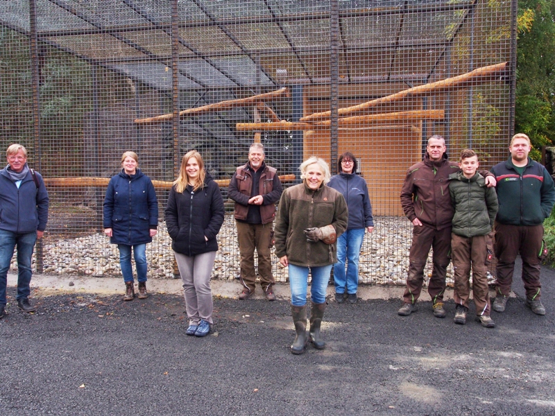 Ein automatischer Schweißschirm, ein Wagen für das Schweißgerät und Handschuhe zählen unter anderem dazu. Und es wurde hier auch ein Werbefilm gedreht. Die Voliere war kaum fertiggestellt, da hieß es schon: Das Uhu-Pärchen kommt! Die Männer vom Bauhof, Stöffel-Park-Mitarbeiter und Falknerin Susanne Kernten (Schulleiterin der Stöffelmaus-Schule) waren bei der Begrüßung natürlich dabei. „Die Tiere sind in Gefangenschaft aufgewachsen und stammen aus einem von dem Zoologen Roman Wüst geleiteten Naturpädagogischen Projekt aus dem Wildpark Saarbrücken, unter dessen Federführung der Umzug der Eulen erfolgte“, erzählt Kernten.